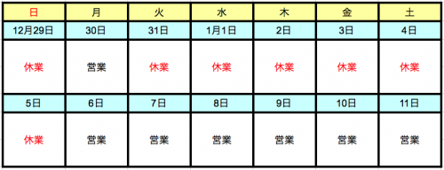 年末年始の営業日のお知らせです。 年末の営業は30日(木)まで、年始は6日(木)からのスタート