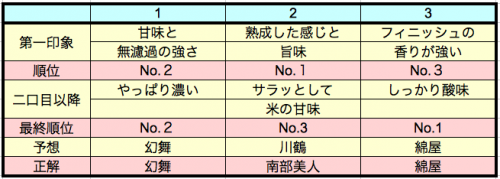 今回も全て初体験のお酒なので銘柄予想はナシ。結果を踏まえて一言です。